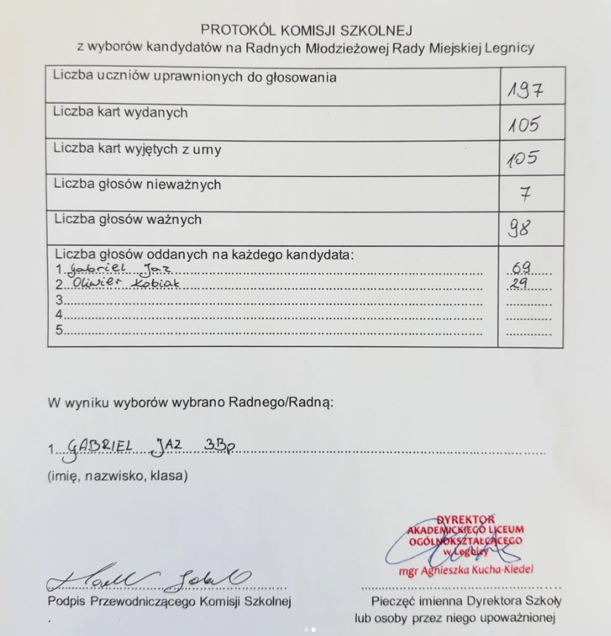 🎉 W wyniku wyborów Radnym Młodzieżowej Rady Miejskiej Legnicy został: